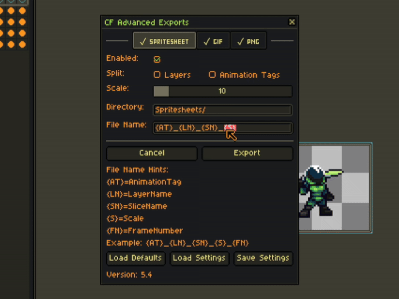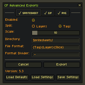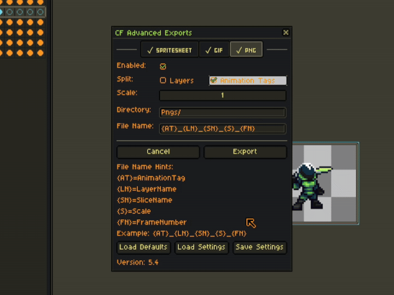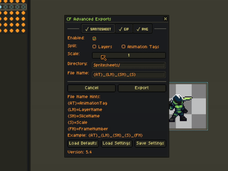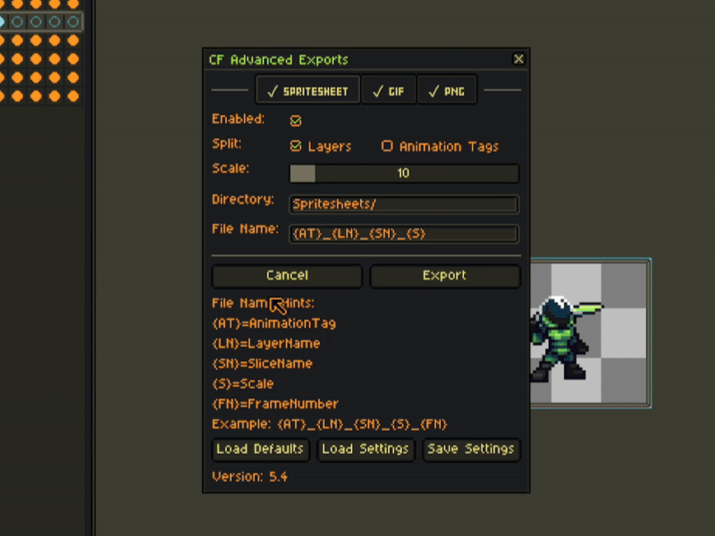 Tired of reconfiguring exports every session? Save your settings directly in your sprite file and load them anytime. Your workflow stays consistent, fast, and hassle-free—no wasted time, no mistakes.